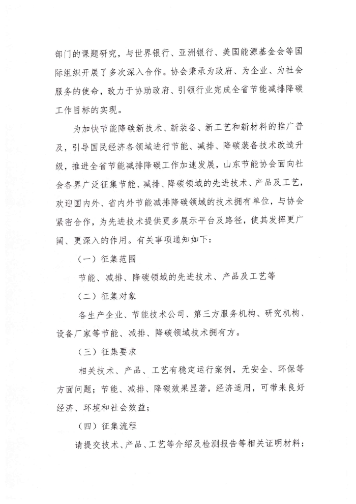 山东节能协会关于征集先进节能减排降碳领域技术的函